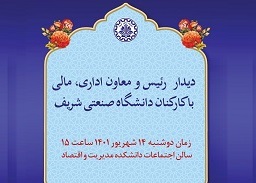 جلسه «دیدار رئیس و معاون اداری، مالی با کارکنان دانشگاه صنعتی شریف روز دوشنبه 14شهریورماه در سالن اجتماعات دانشکده مدیریت و اقتصاد دانشگاه برگزار خواهد شد.