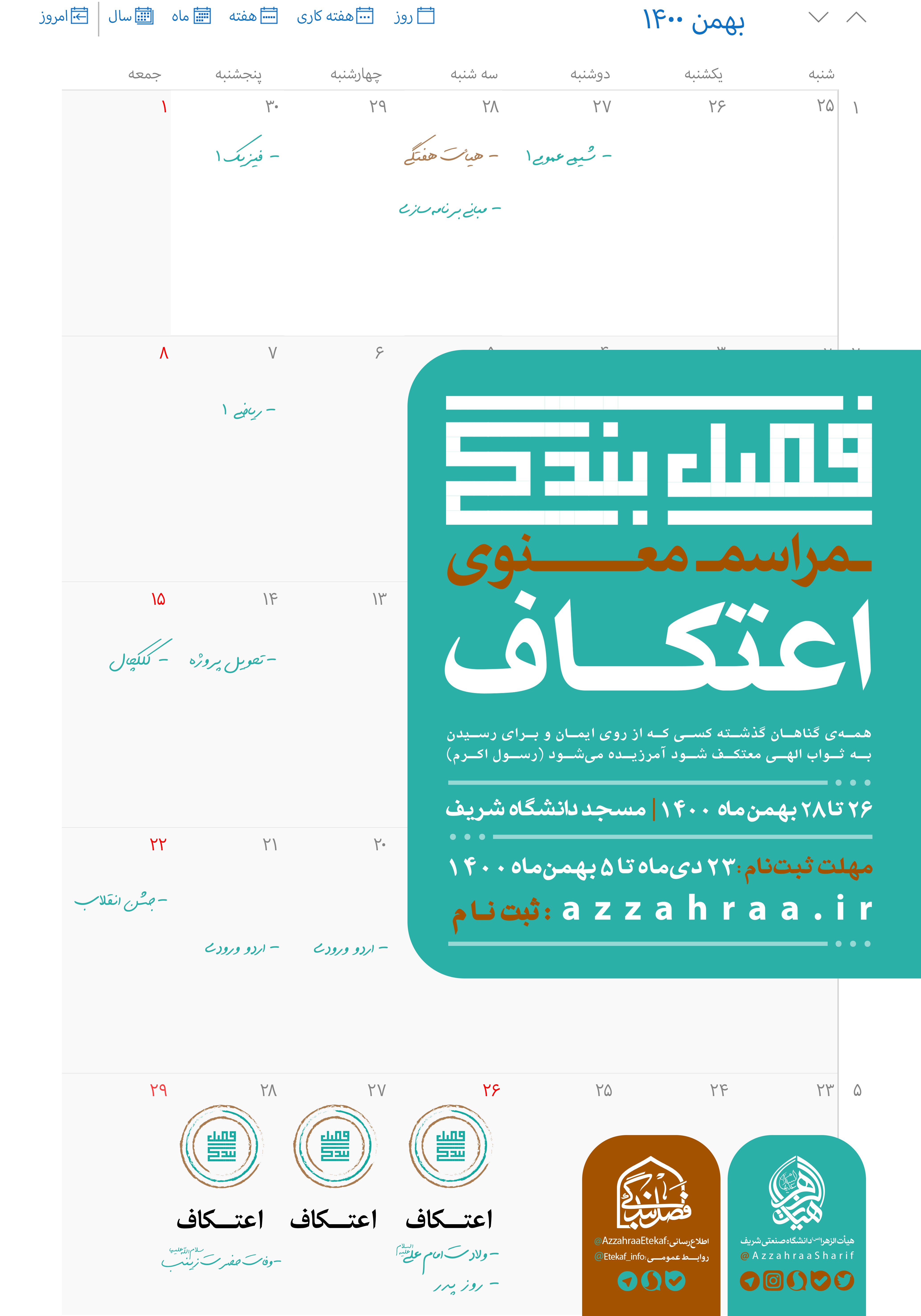 مراسم معنوی اعتکاف رجب، ۲۶ تا ۲۸ بهمنماه ۱۴۰۰ در مسجد دانشگاه شریف برگزار میشود. ثبت نام در این مراسم از ۲۳ دیماه آغاز و تا ۵ بهمنماه از طریق آدرس account.azzahraa.ir انجام میشود.