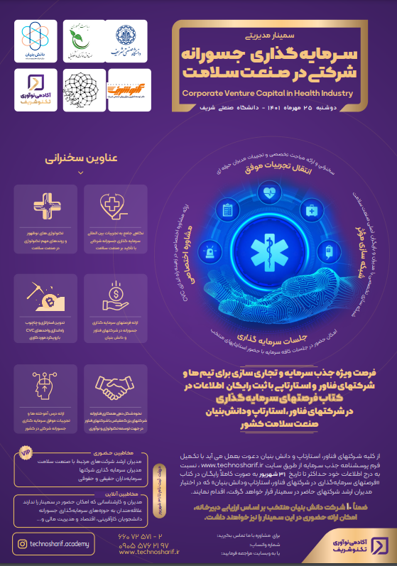 سمینار مدیریتی سرمایهگذاری جسورانه شرکتی در صنعت سلامت، با حمایت دانشگاه صنعتی شریف و صندوق نوآوری و شکوفایی ریاست جمهوری، برگزار میشود.