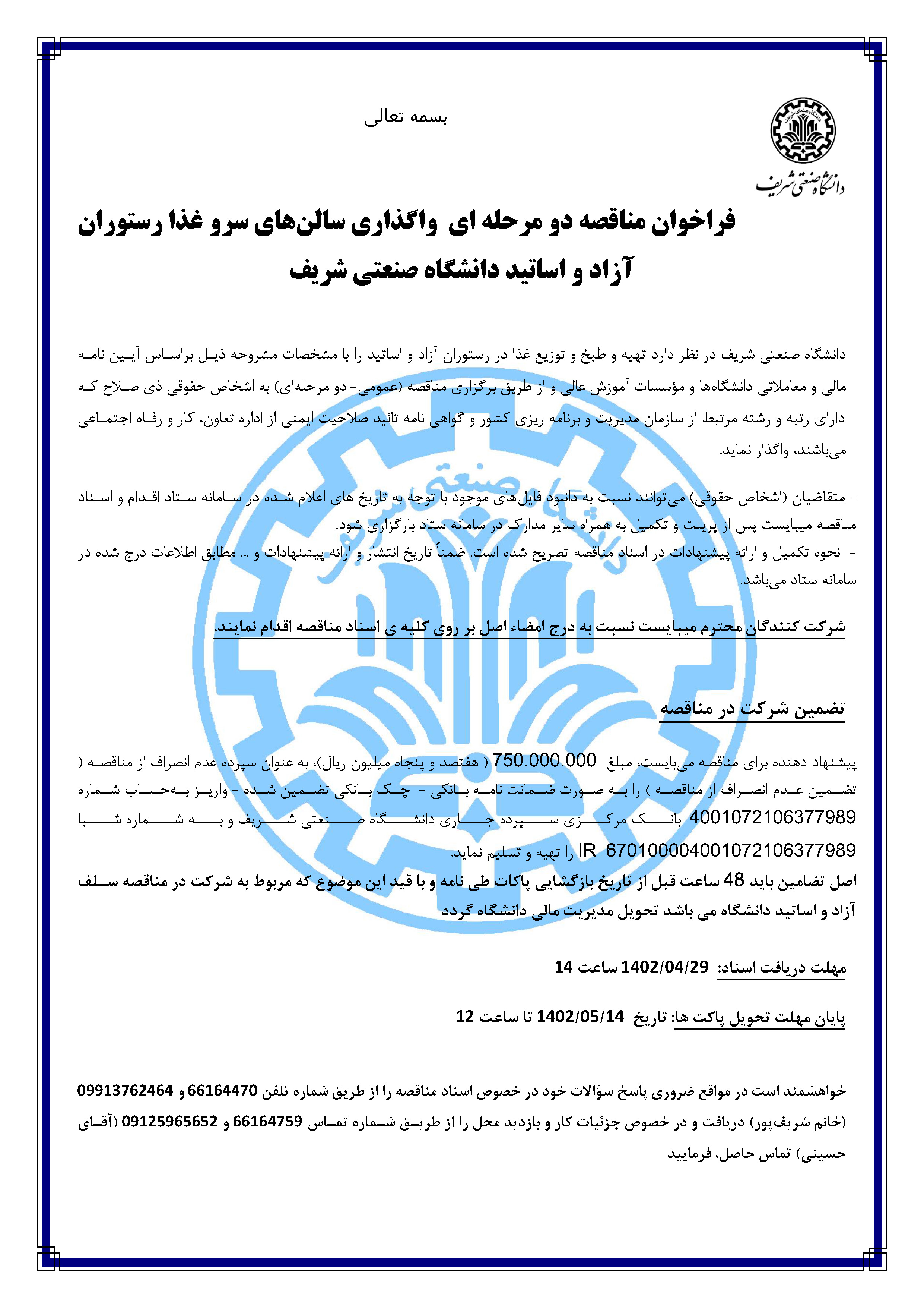 فراخوان مناقصه دو مرحله ای واگذاری سالنهای سرو غذا رستوران آزاد و اساتید دانشگاه صنعتی شریف