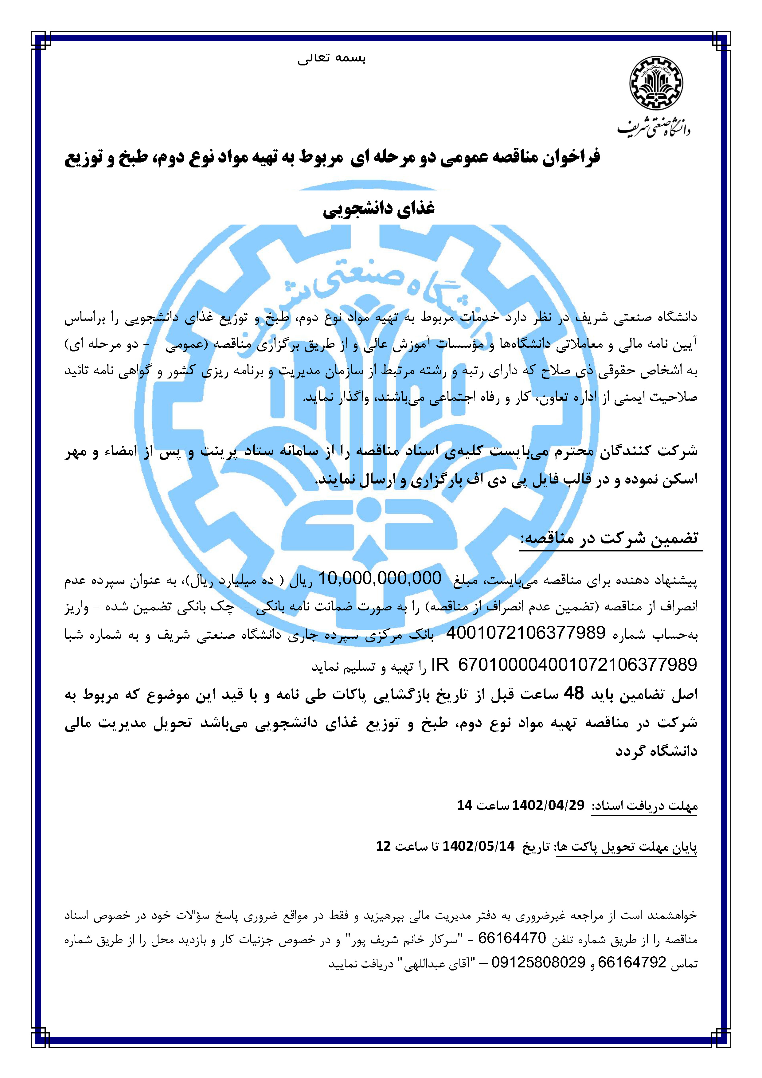 فراخوان مناقصه عمومی دو مرحلهای مربوط به تهیه مواد نوع دوم، طبخ و توزیع غذای دانشجویی