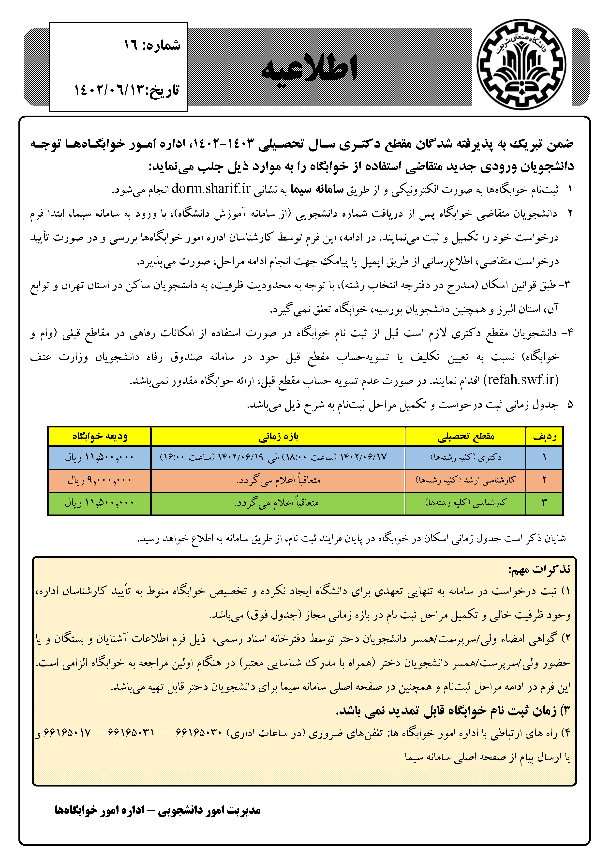 قابل توجه پذیرفتهشدگان مقطع دکتری متقاضی استفاده از خوابگاه